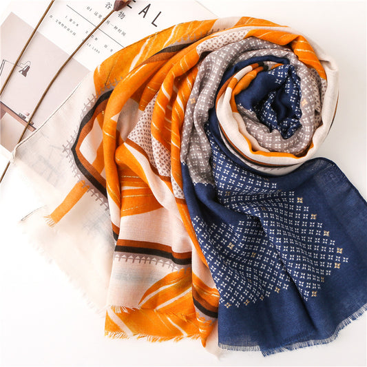 Gold stamped orange yellow leaves print navy grey fringed scarf