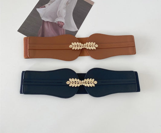 Synthetic leather wide stretch belt with leaves buckles