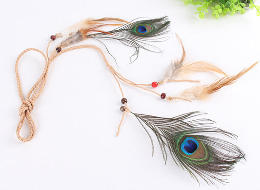 Braide suede tie with brown and peacock feathers