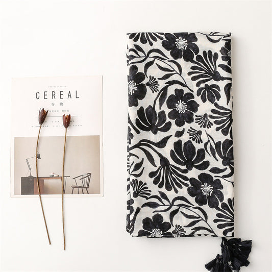 Black flowers print scarf with tassels
