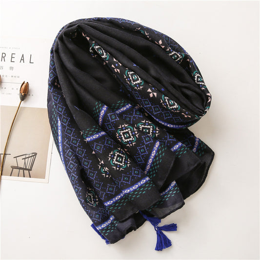 Black royal blue geometric prints square scarf with beads tassels