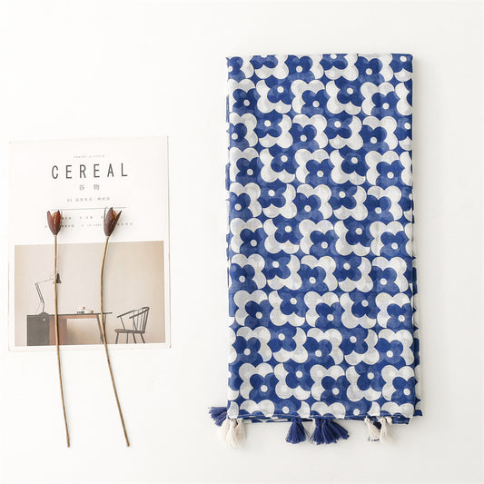 Blue white floral print long scarf with tassels