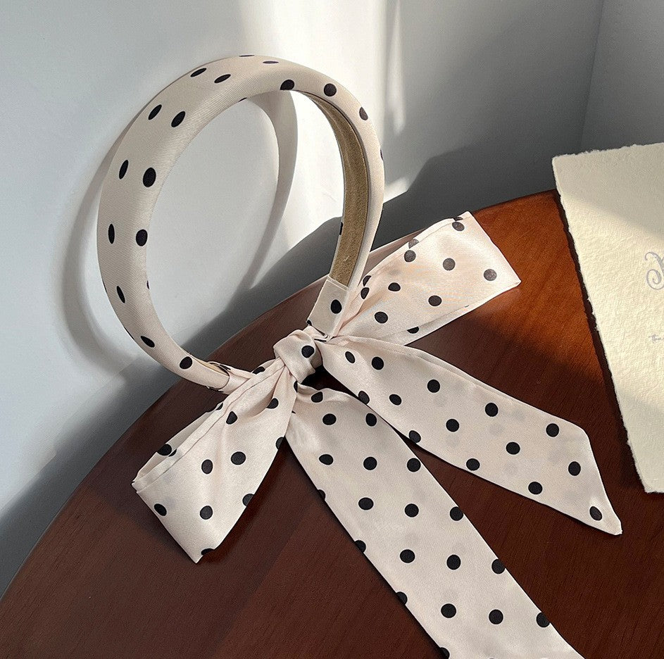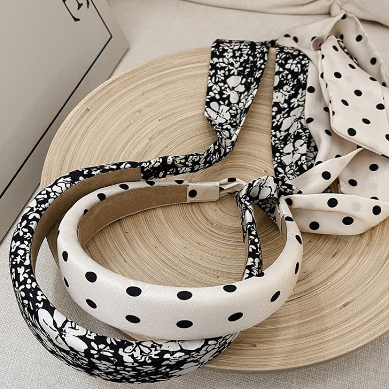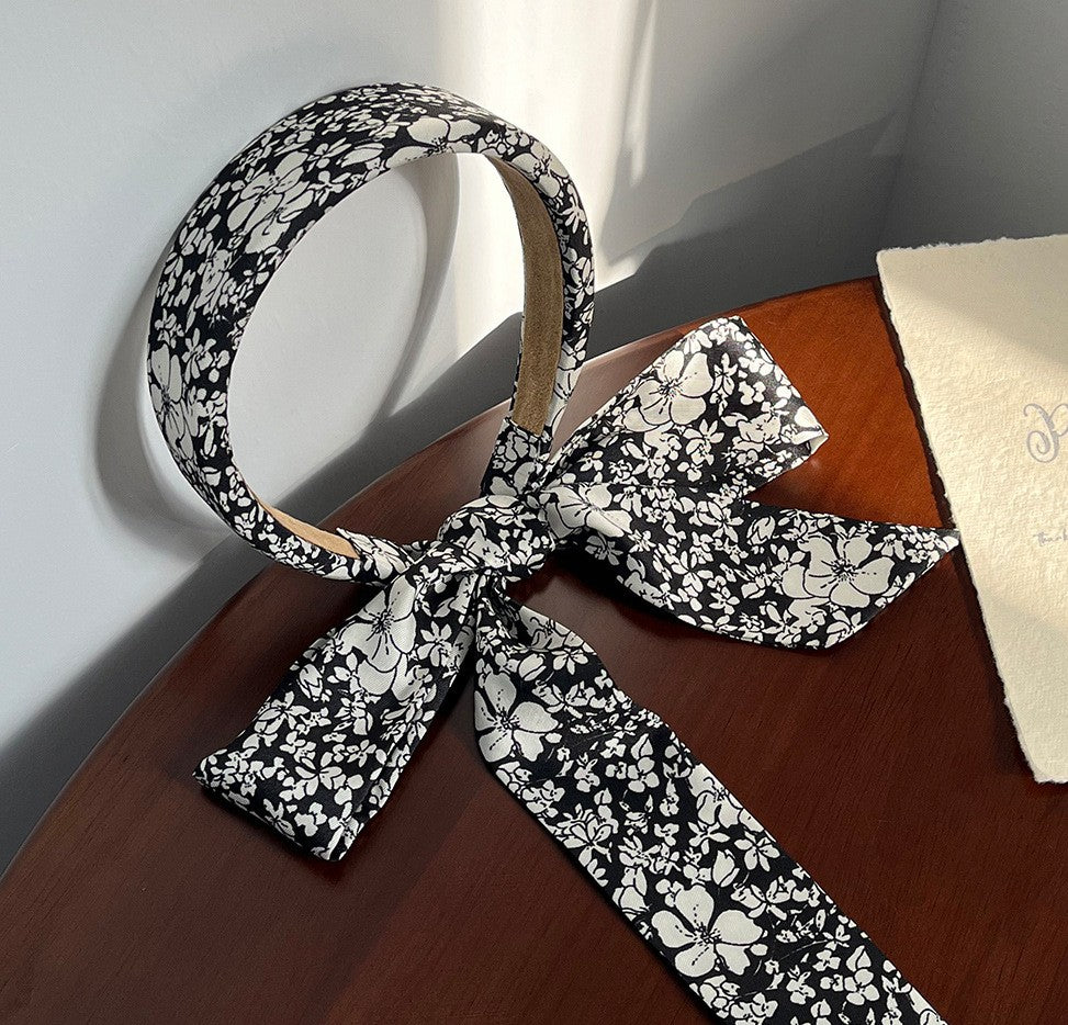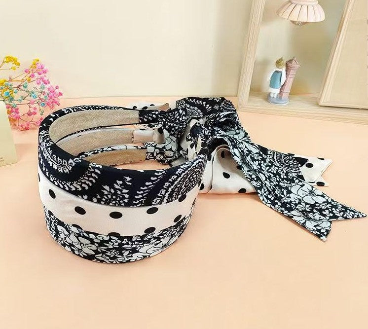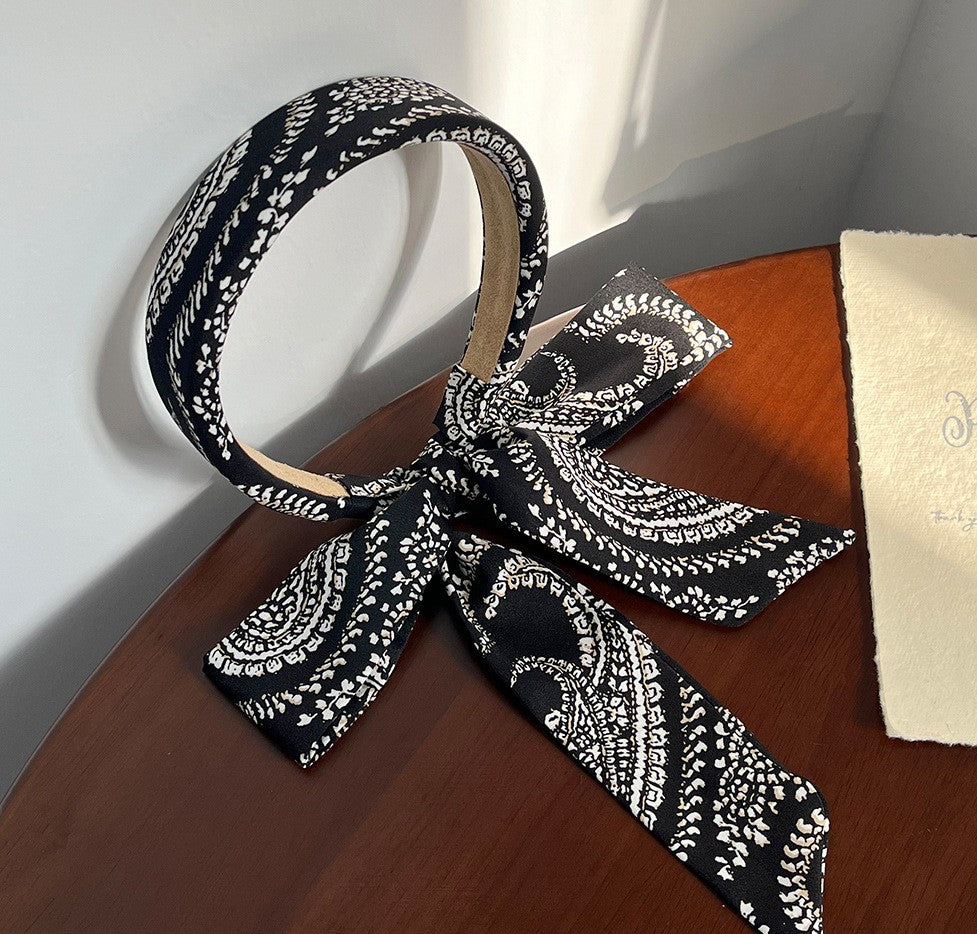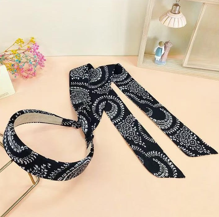 Experience refined comfort with this stylish headband featuring long scarves. Crafted from smooth satin fabric showcasing an exquisite pattern, it offers both elegance and softness. The headband is 3cm wide with 1cm of padding, while the attached scarves measure 50cm in length.