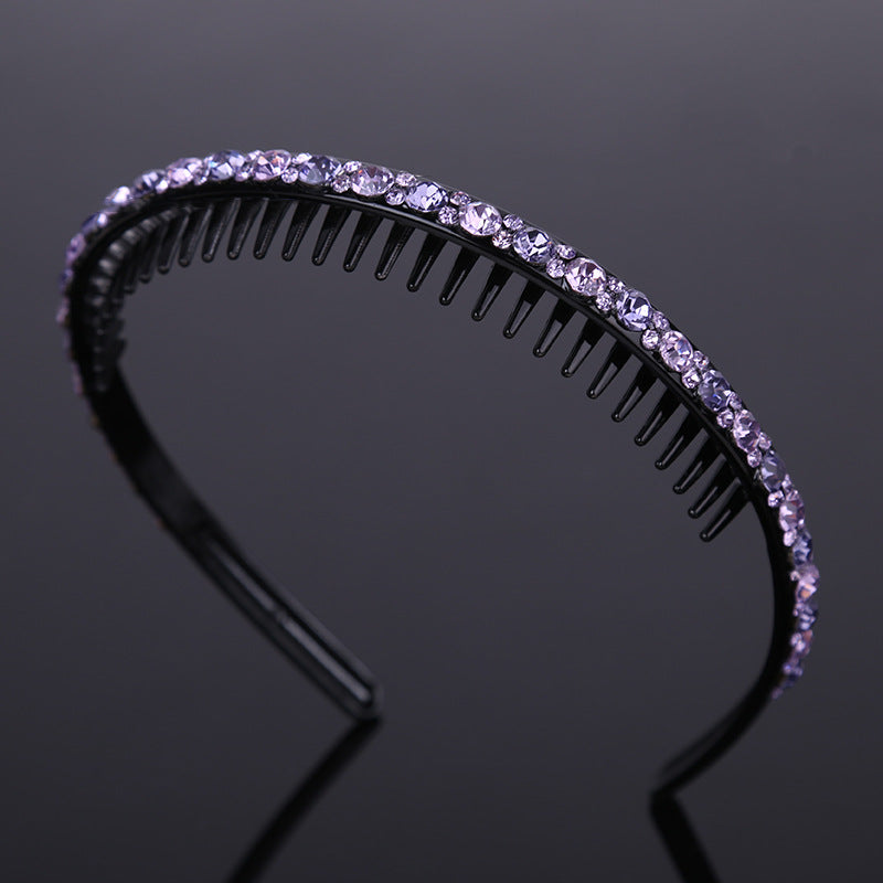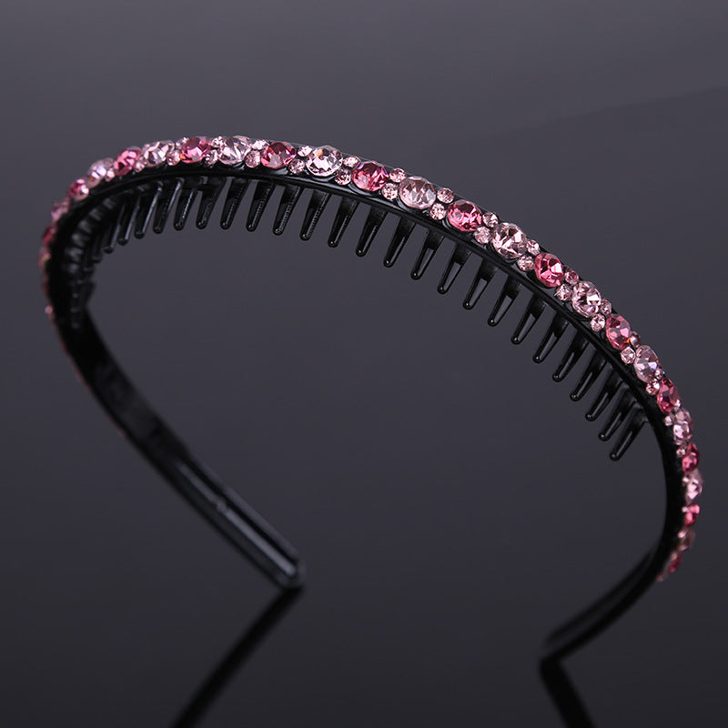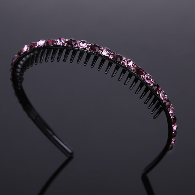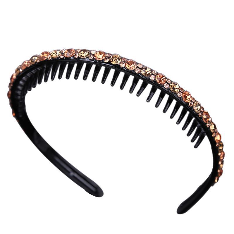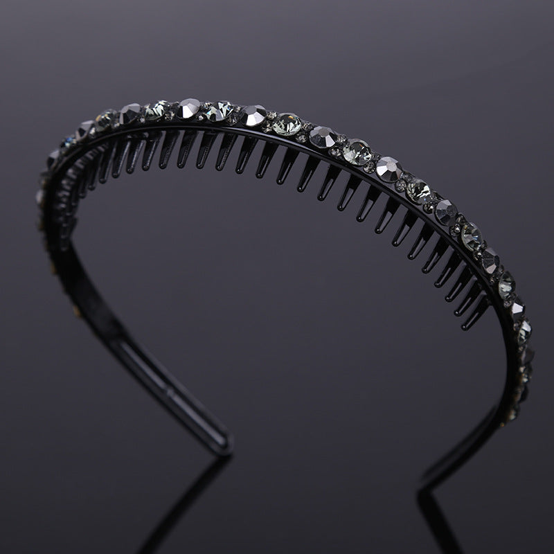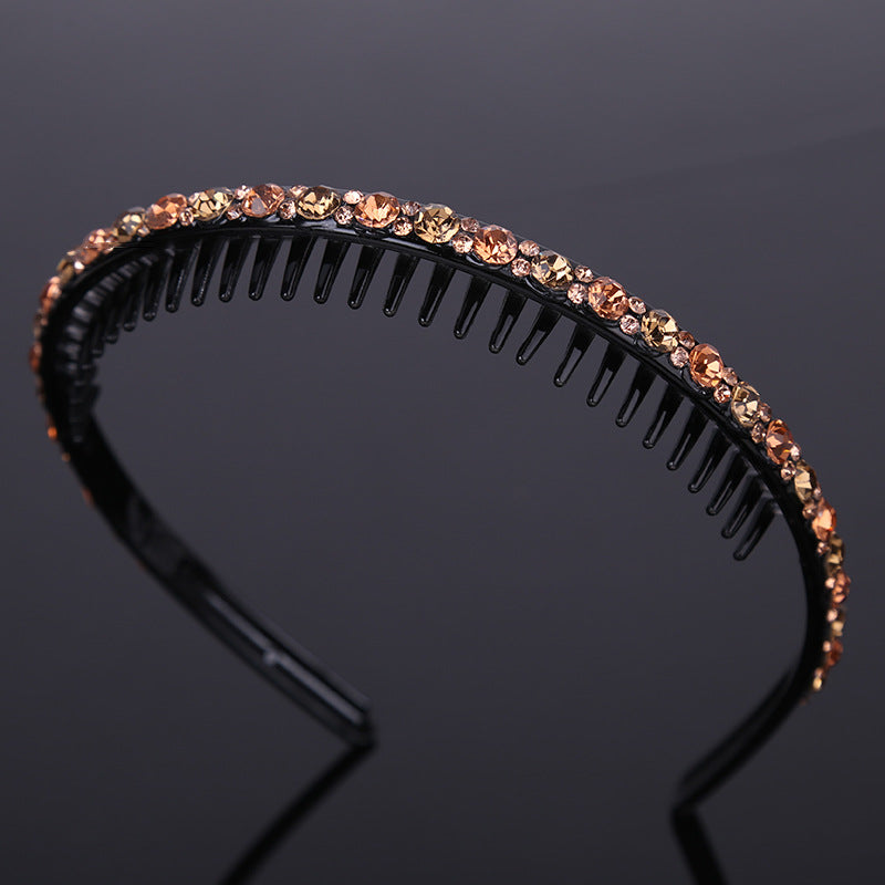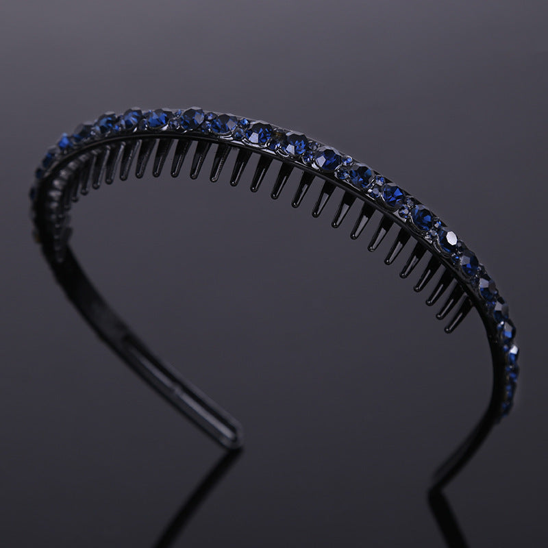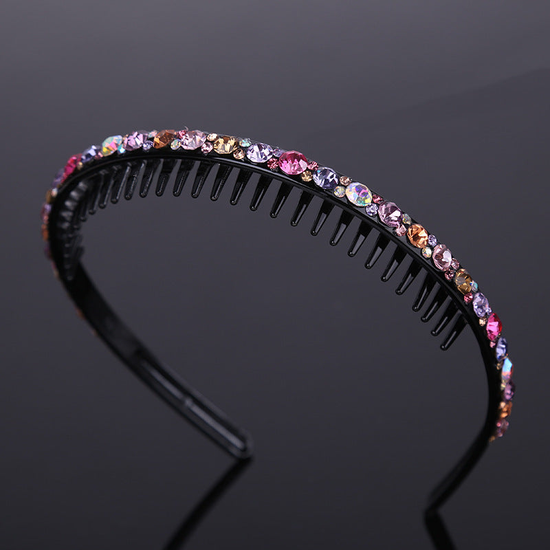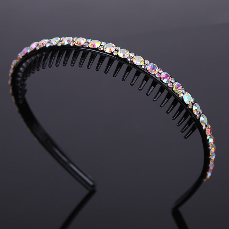 This headband is adorned with beautiful multicoloured rhinestones and features flexible, black acrylic material. With 1.5cm long teeth, it offers a secure and comfortable fit.