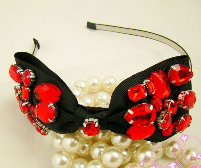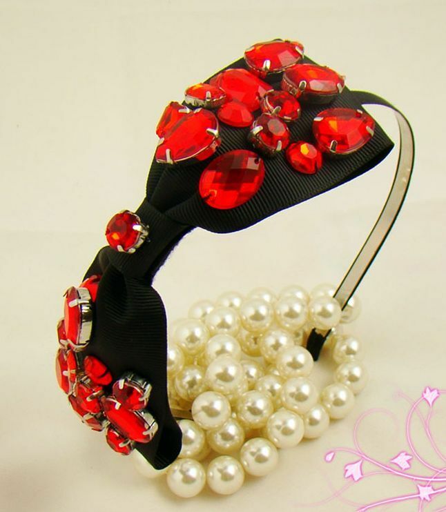 Stunning red gems studded black bow headband